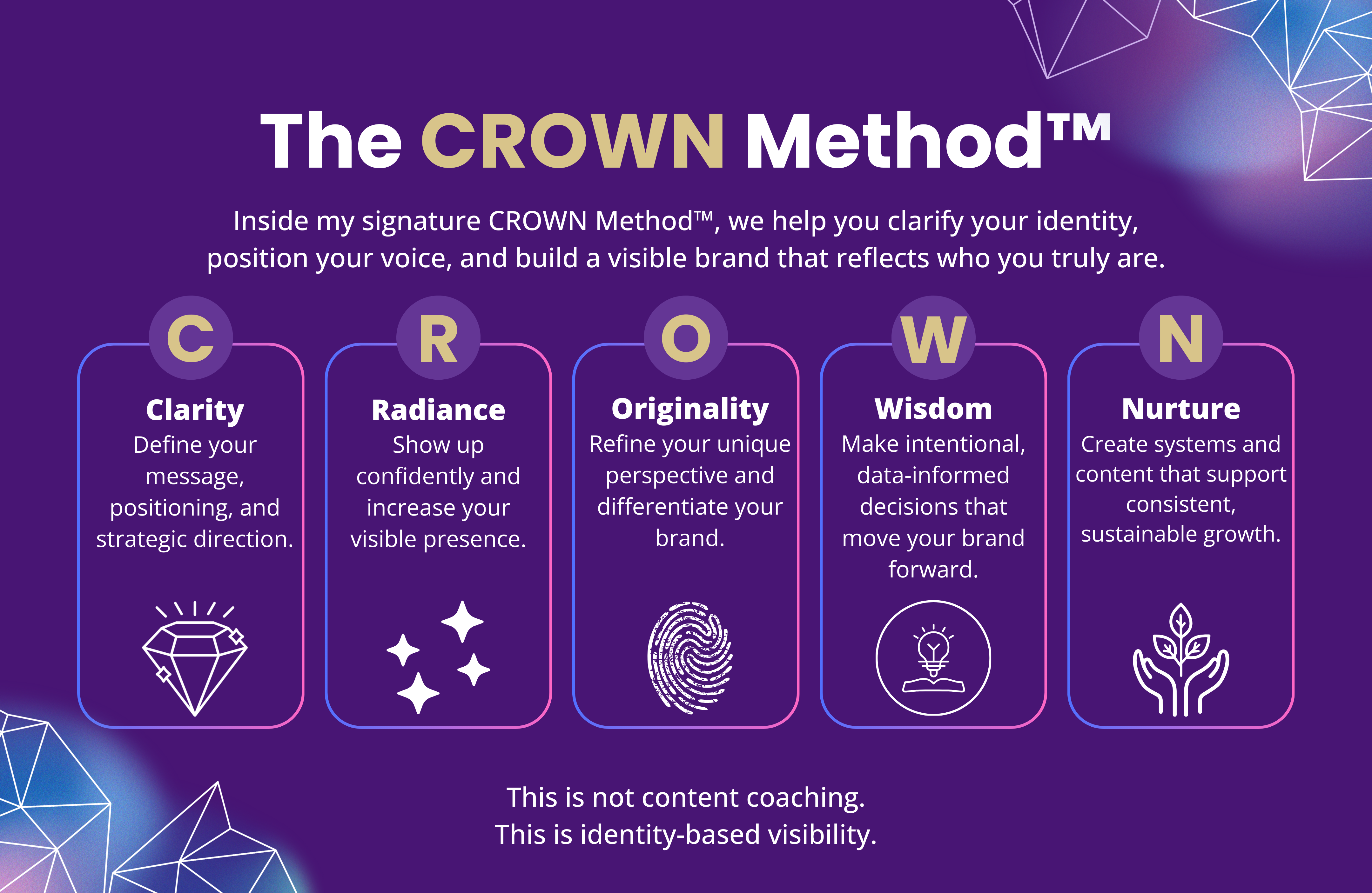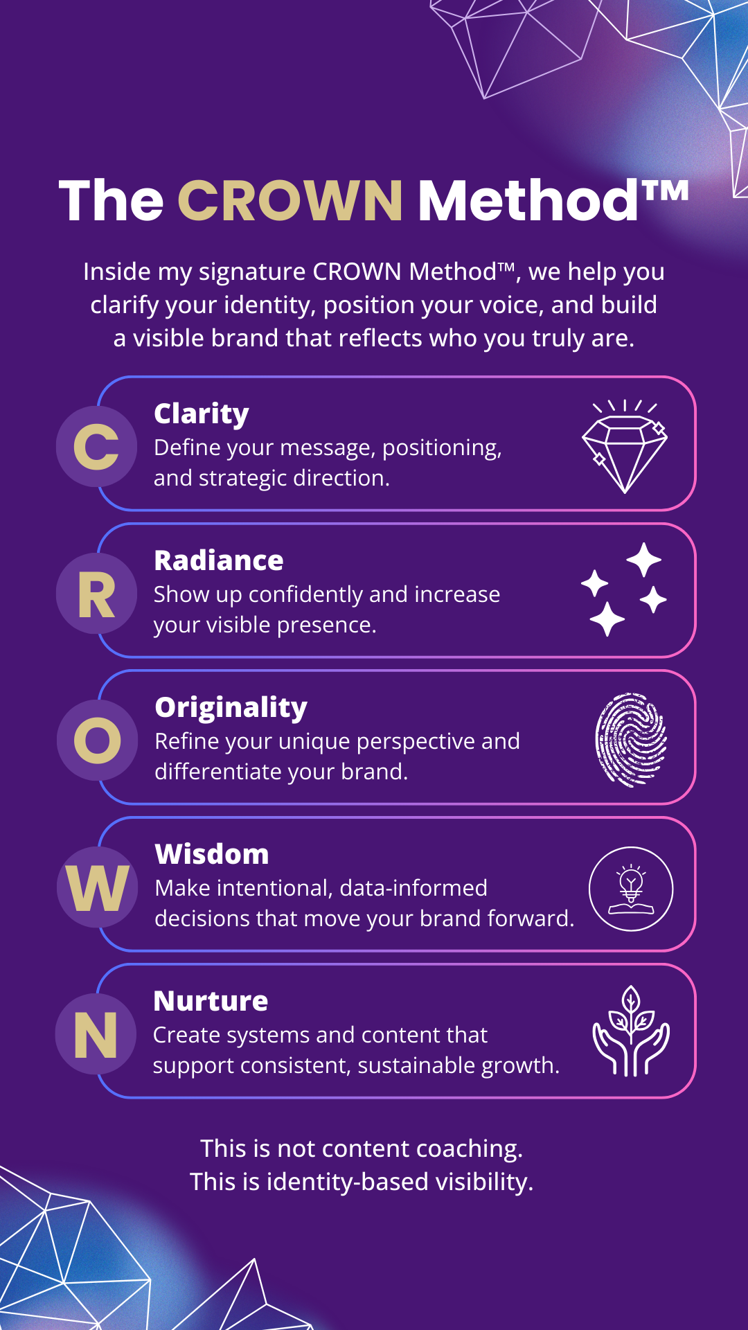 I guide purpose-driven women to clarify their message, strengthen their positioning, and show up with confidence so their visibility matches their vision.